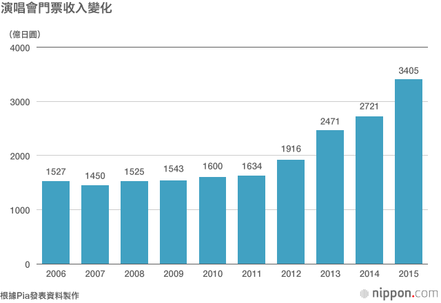 值得一提的是,雖然日本整體音樂市場持續低迷,但演唱會市場規模卻在不斷擴大。2015年達到3,405億日圓,已經超過實體唱片市場。日本人以另一種方式證明了自己對音樂的喜愛。隨著國內旅遊的火爆,如果能夠吸引更多外國遊客訪日,相信演唱會市場還會有很大的發展空間。