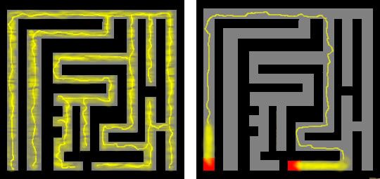黏菌具有緩慢朝著餌料移動的特性。同時,如果餌料存在於多個地方,它們就會構建血管一樣的管狀結構來連接餌料。管內流動著叫做「原形質」的黏稠液體,這種液體會像血液一樣把養分送到菌體各處。這個管狀結構恰恰可以揭示迷宮的答案。