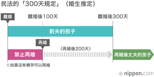 日本民法規定,妻子在婚姻期間懷孕所生的孩子推定為丈夫的孩子(民法772條第1項),這個原則叫「婚生推定」。由於難以證明妻子在婚姻期間是否已經懷孕等原因,民法又規定,結婚200天之後或離婚後300天之內出生的孩子,都被認定為妻子在婚姻期間懷孕的孩子(第2項)。