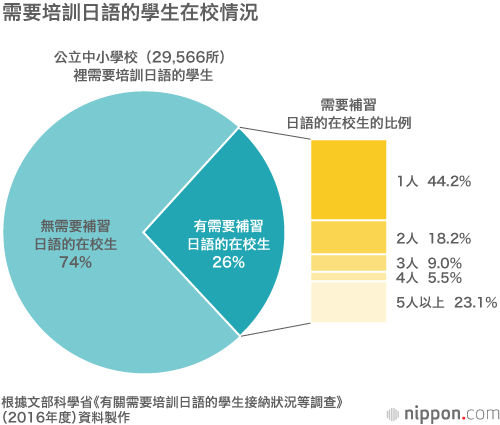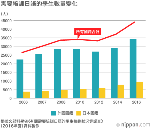 2016年,在日本全國公立學校(小學、國中、中等教育機構、高中、特別支援學校等)上學的孩子中,不會日語、學習跟不上,「需要補習日語的學生」超過4.3萬人,在過去的10年裡成長了1.6倍以上。這個數字不僅僅指外籍的孩子,也包括雖有日本國籍但因常年寄養在海外親戚家裡,日語不是母語的孩子。而且,其中1萬人在學校裡沒有得到任何幫助,面臨陷入真由美那種「雙限雙語」狀態的風險。