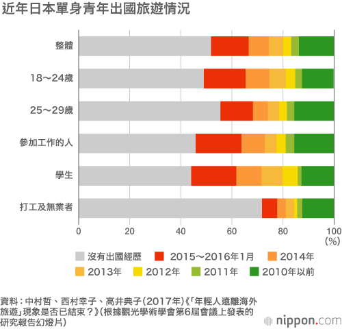 根據2016年2月對18~29歲的日本單身青年實施的調查(下圖),沒有出國經歷者為51.8%,2015年出國旅遊1次以上者為14.7%。也就是說,約85%的受訪者在2015年沒有出過一次國門。從類別來看,學生當中,44%的人沒有出國經歷,2015年出國1次以上者為17.7%;打零工和無職業的年輕人中,有71.7%沒有出國經歷,2015年的出國人數僅占6%。