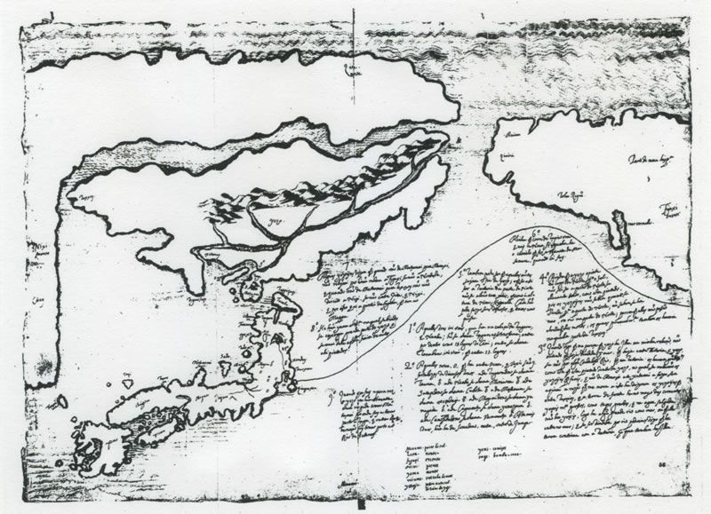 安吉利斯描繪的蝦夷地區地圖。從圖中可以看出,安吉利斯認識到北海道是位於本州北部的巨島,靠近中國的東北部和朝鮮。(H・奇斯里克編著《北方探險記——元和年間外國人的蝦夷報告書―》吉河弘文館出版,1962年)