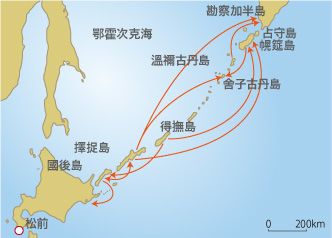 連接北海道、千島、勘察加的交易通路。阿伊努民族經由千島群島到達勘察加半島,並將從這裏得到的商品帶往松前(北海道)