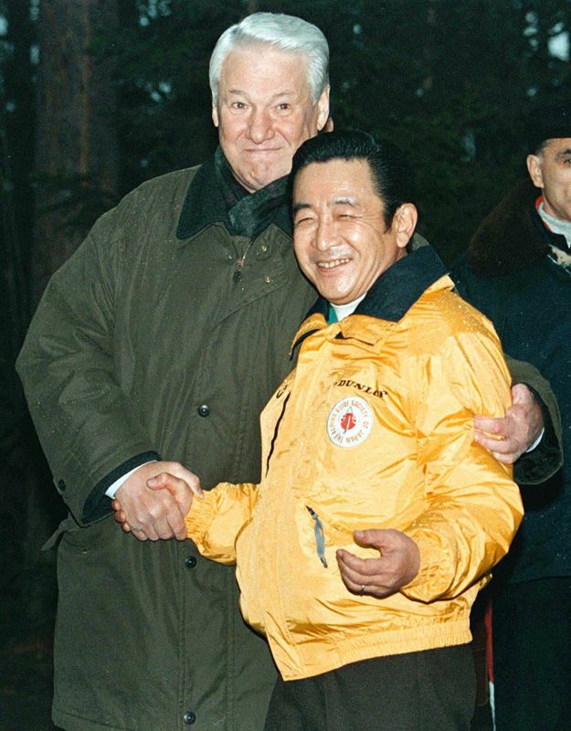 橋本龍太郎首相(右)和葉爾辛總統在克拉斯諾亞爾斯克郊外舉行的首腦會議前相互握手。
