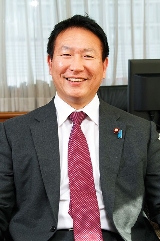 生於1967年。京都大學法學系畢業後進入大藏省(現財務省),歷任主稅局、金融廳、內閣總理大臣的秘書副官、岩手縣農林水產部規劃科科長等。2005年,在眾議院大選中初次當選。2007年,在達佛斯論壇上被選為“2007年全球青年領袖”之一。2011年,就任野田內閣經濟產業大臣政務官。
