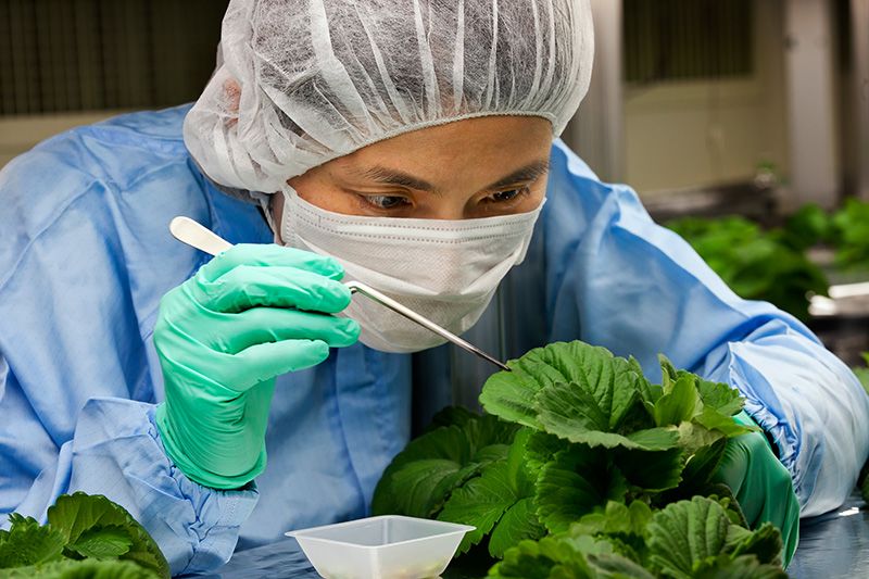 產綜研北海道中心開發的植物工廠內,種有可用於生產犬類牙周病(*1)治療藥物的原材料草莓。這裏的草莓之所以能成為藥物原材料,是因為它們被植入了可形成特殊蛋白質的基因。為了培育用於生產藥品的轉基因作物,需要一種封閉設備,避免轉基因植物與其他植物雜交後對生態系統造成影響,但過去一直沒有任何擁有這種設備的植物工廠。而這座工廠在全球首開先河,實現了在密閉空間內完成從種植用於製藥的轉基因植物到製造藥品這一系列流程的創舉。