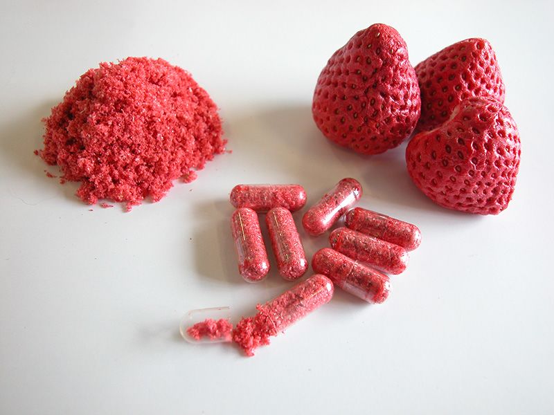 草莓的栽培期大約是5個月。首先是增殖已作了基因改造的草莓植株,培育秧苗。然後,移栽到植物工廠的培育室,經過4個月左右,草莓就會結成果實。令人垂涎欲滴的果實中含有干擾素。將果肉粉碎後冷凍乾燥,然後加工成粉末,再製成片劑投餵犬隻。