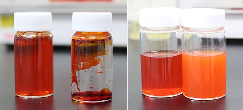 照片(左)雨生紅球藻剛剛溶於水中的情形。左側瓶中用的是富士軟片獨有的奈米技術進行乳化分散處理的雨生紅球藻成分。採用單純攪拌方法的右側瓶中,雨生紅球藻和水出現分離,而左側則混合均勻;照片(右)富士軟片公司奈米技術和以往奈米技術之比較。用以往的奈米技術配製的右側瓶中液體呈現混濁狀態,而用獨有的奈米技術配製的左側瓶中液體清澄透明