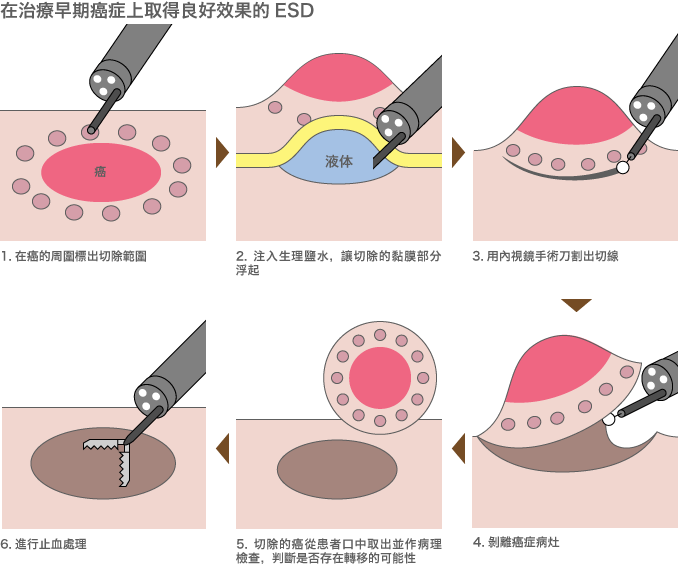 內視鏡黏膜剝離術(ESD),是最新的內視鏡治療術。以前的內視鏡黏膜切除(EMR)治療術,是用套索狀的器具夾住腫瘤後予以切除,所以可切除的腫瘤大小有限。ESD是用內視鏡手術刀切除,所以對付2cm以上的腫瘤也游刃有餘。據說在日本胃癌患者的四分之一接受的都是這種ESD治療。參考文獻:《不開刀切癌症:詳解ESD內視鏡治療術》,講談社