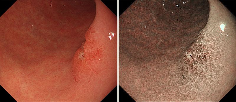 近年引人注目的是特殊光觀察技術。該公司的「窄頻成像(NBI,Narrow Band Imaging)」技術(下圖)。