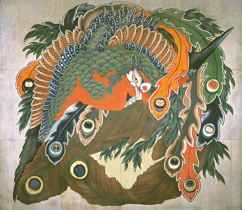 小布施也是北齋熱愛的城鎮。曹洞宗岩松院正殿的頂棚上有北齋繪製的《八方睨鳳凰圖》(岩松院提供)。使用的是從中國購買的礦物顏料,迄今為止從未修補過。166年後的今天仍然色澤鮮豔