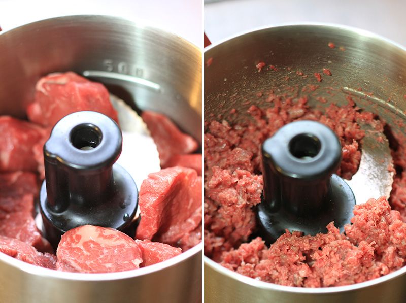 牛肉轉瞬間就絞成了肉餡。刀片的旋轉速度可以通過無級調速轉盤調整,因此無需擔心絞過頭