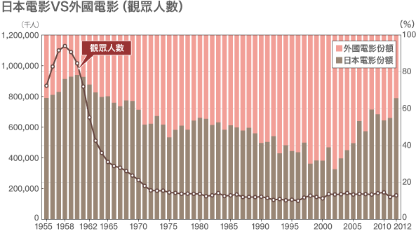 大致是在20世紀70年代後,外國電影開始凌駕於日本電影之上,日本的電影市場長期處在所謂的「洋高邦低」狀態中。據日本電影製片商聯盟(影聯)發布的1955年之後的統計數據顯示,1955-65年間,日本電影在整個電影市場中的份額(發行收入(*1)的占比)達到了60%以上。頂峰出現在1960年。當年,日本電影的市場份額高達78%,給人留下一種「日本電影全盛期」的印象。然而,1970年之後,日本電影持續低迷,泡沫經濟破滅後的2002年,市場份額跌至了史上最低的27.1%。