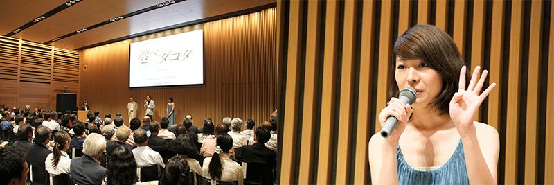 在新潟舉行的電影試映會(左)。主題曲《Homesick Lullaby》的演唱者石井里佳(右)