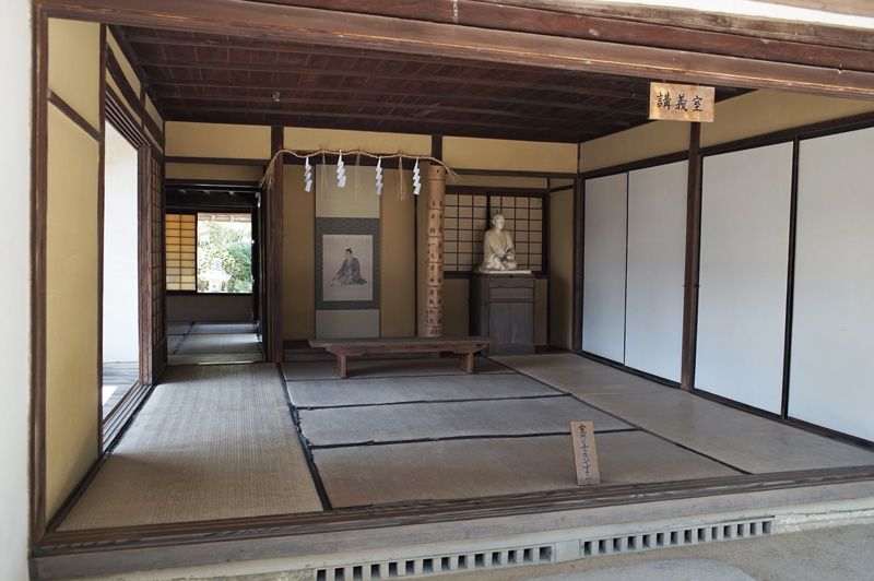 松陰講學的私塾「松下村塾」的建築,在山口縣的萩市現在還保存著。萩市北臨日本海,平地不多,西邊是城堡和中心街區。松下村塾位於平地東端,屬當時的郊區,是用自家小屋改造而成,有8畳(*1)和11畳半大小的兩間平房,十分簡陋。1907年(明治40年)在小屋旁興建了「松陰神社」,松下村塾成為神社中心。雖然松陰神社在明治維新多年之後才修建,但神社內部至今每年都進行整修;1922年被指定為國家級歷史遺跡;戰後的1955年新建了神殿;2009年,被追加到當時正在申請聯合國教科文組織(UNESCO)世界遺產的「九州‧山口近代化產業遺產群」名單裏;另外,還建有介紹松陰事蹟的資料館「至誠館」,作為神社的寶物館。這裏已成了日本人心目中的「聖地」。不僅如今,尤其是將來,隨著時間的推移將越來越受到人們的尊崇。
