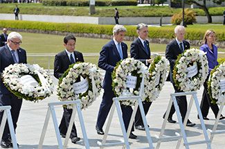 5月27日,歐巴馬作為美國在任總統首次訪問原子彈轟炸地廣島,與安倍晉三首相一同向原子彈轟炸死難者紀念碑獻了花。歐巴馬總統在原子彈轟炸受害者組織的代表、廣島和長崎兩市市長面前發表了演講,向第二次世界大戰所有罹難者表達了哀悼之意,並呼籲尋求實現「無核武世界」。