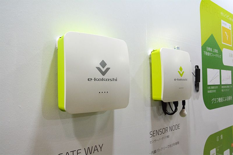 「e-kakashi」在國際農業技術博覽會上亮相。此新款與溫室的換氣窗和田地澆水閥門等聯動,還配有人工智慧技術遠端控制功能(2017年10月於千葉市幕張展覽館)
