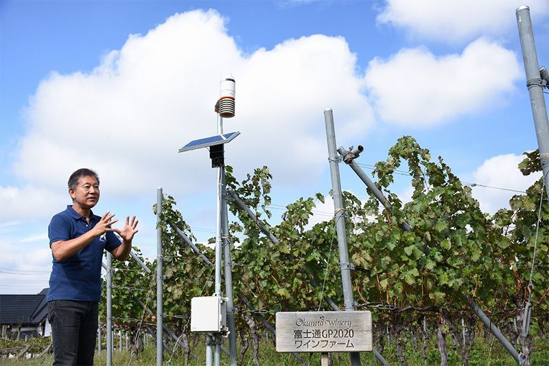 10月上旬,從甲府盆地東部的鹽山到勝沼地區之間,是一望無際的葡萄樹上掛滿了沉甸甸的果實。在這擁有在明治時代就開始釀造葡萄酒的歷史,奧野田酒莊導入了感應器和無線網路的資訊通訊技術(ICT),改革傳統的葡萄種植管理方法,並成功地大幅削減了農藥用量。
