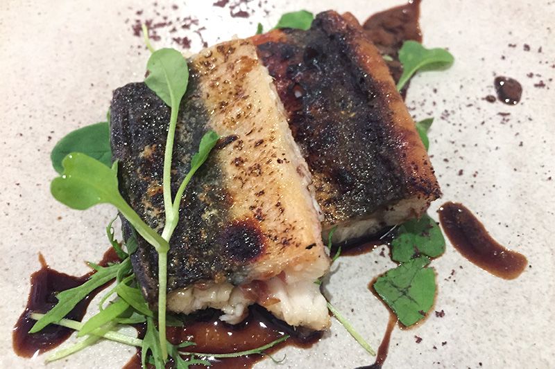 下一道送來的菜色是鰻魚,但處理手法和一般印象中的蒲燒鰻魚截然不同,我不禁感嘆原來鰻魚還有這種吃法。先把鰻魚皮在活生生的狀態下剝除,然後用備長炭烘烤,接著再拌入紅酒熬成的醬汁。