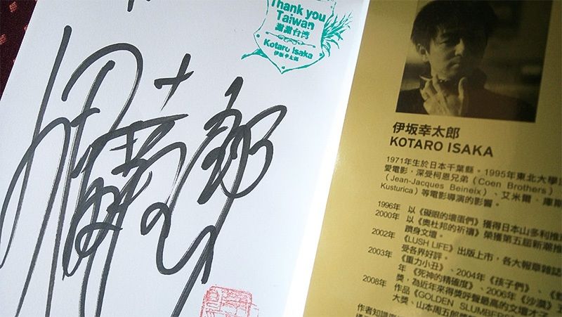 伊坂幸太郎於2013年在臺灣舉辦讀者見面會的簽名與謝謝臺灣印章(攝影:米果)