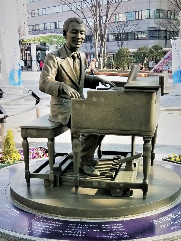 東口還有作曲家「古關裕而」的雕像,這位生於明治、逝於平成、出身福島的音樂家,而今面帶微笑坐在鋼琴前方,他生前創作的名曲旋律,輪流在整點時,成為迴盪車站周邊的報時音樂。我恰好在正午聽到他為甲子園高校野球譜的「栄冠は君に輝く」,黃昏則是聽到「福島夜曲」。包括早稻田與慶應大學、讀賣巨人、阪神虎、中日龍的加油歌都是他的作品,他不僅幫母校「福島商業高校」寫了校歌,全日本高達300多校的校歌也出自他的創作,生涯作品超過5千首,福島車站月臺發車音樂也採用他譜寫的旋律。據說他作曲時不依靠任何樂器,所有音符旋律全部在腦裡完成。