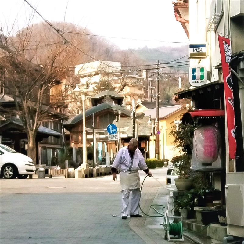 趁著天黑之前離開,踩著三百多年前松尾芭蕉師徒兩人的足跡,途中遇到料亭師傅在店外灑水打掃,夜晚用膳的客人,應該很快就到來。