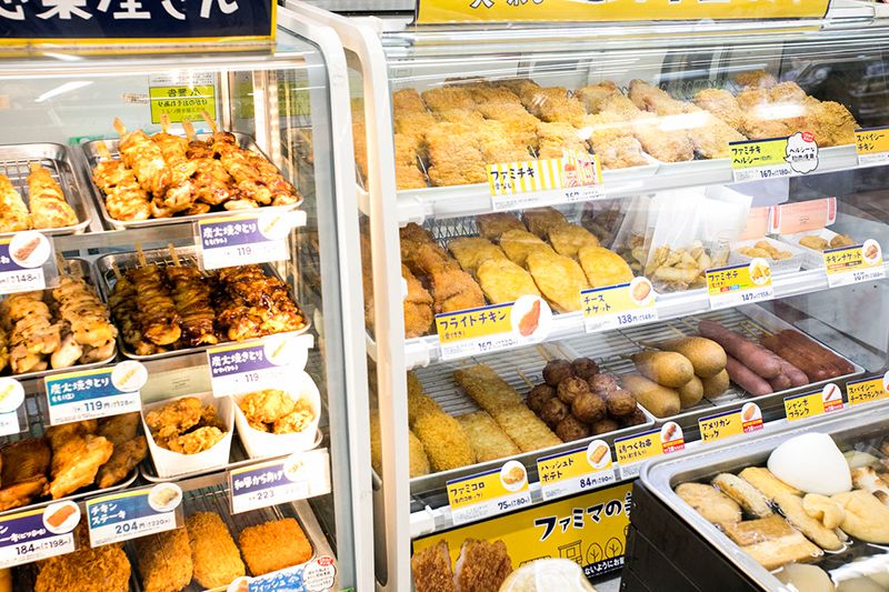 超商獨家美食中,收銀臺邊上賣的熱呼呼的小吃備受外國遊客好評。從炸可麗餅、烤雞肉串、日式炸雞等日本獨特的大眾美食,到老少鹹宜的熱狗、炸雞塊,還有肉包子、春捲等中式點心,可以讓你一飽口福。