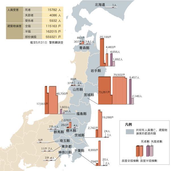 東日本大地震發生6個月後的9月11日,根據警察廳的統計,日本全國的遇難者為15,782人,失踪者為4,086人,大大超過了1995年的阪神淡路大地震,成為戰後最大的一次自然災害。