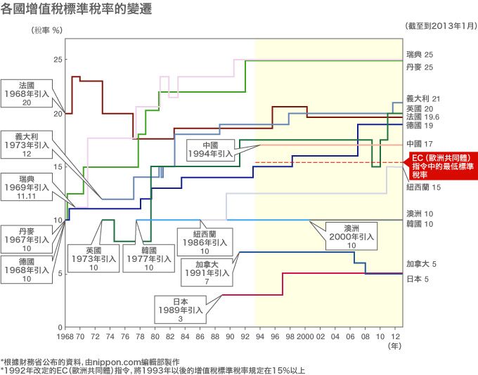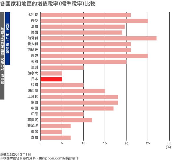根據財務省的資料,將我國的消費稅率和其它國家、地區的增值稅率(標準稅率)做一比較,可以看到,日本現行的5%消費稅率,在世界主要國家和地區中,與加拿大、臺灣同屬最低水準。但是在加拿大,除了聯邦財貨服務稅(增值稅)以外,幾乎所有省都各自徵收增值稅(例如,安大略省為8%)。另外,美國各州、郡、市則徵收零售稅。