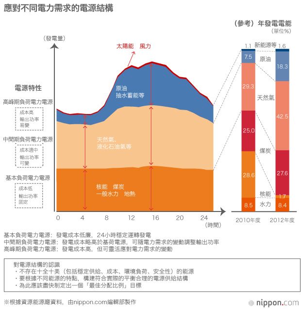 發電使用的能源多種多樣。除核能外,還有原油、液化天然氣等火力、水力,以及地熱、風能、太陽能等可再生能源。從中長期角度出發,要求政府從政策上最佳化組合各種能源,制定出一個「最佳分配比例」。