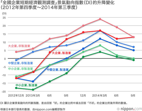由於今年7~9月的國內生產毛額(GDP),是決定再度上調消費稅與否的最終判斷依據,因而備受人們關注。2014年11月17日發布的速報值顯示,實際GDP換算成年率,為-1.6%,連續兩個季度呈現負成長。這一結果大大出乎經濟學專家的預料,讓股市帶來巨大衝擊。它凸顯了今年4月消費稅上調至8%後出現的困局,占GDP近六成的個人消費萎靡不振且至今尚未好轉。