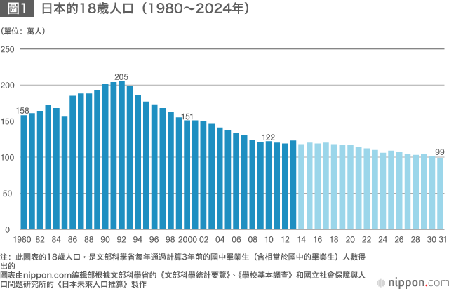 根據文部科學省的《大學基本調查》數據,戰後日本18歲的人口,在被稱作「團塊世代」(*1)的那一代人迎來18歲的1966年達到249萬人的峰值後開始減少,雖然之後又有所回升,但從1992年「團塊Jr.」(*2)高中畢業時的205萬人,一路減少到了2014年的118萬人。最近幾年雖處於平穩狀態,但根據國立社會保障和人口問題研究所推算,18歲人口自2018年前後開始減少傾向會再次增強,2031年為99萬人,將跌破百萬大關。