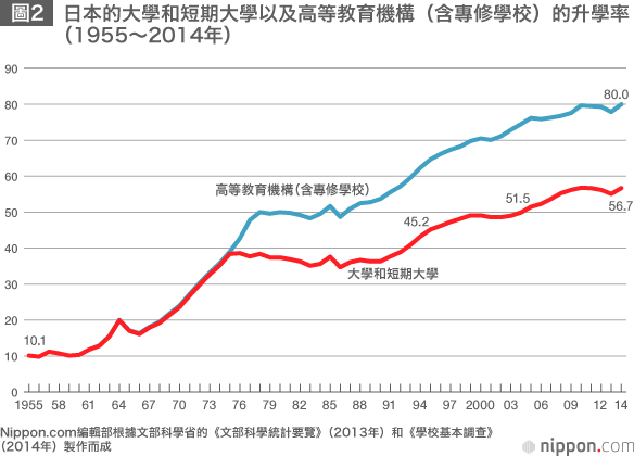 大學和短期大學(*3)合併計算的大學升學率,在上世紀70~80年代為36~37%,1995年為45.2%,2005年則上升至51.5%,2014年達56.7%。如果再加上專修學校,那麼升學率在2014年就為80.0%。如今是兩個人中就有1個人在上大學的高學歷時代。反過來說,如果學生沒有大學和專業的特定選擇要求,那麼日本事實上在2000年左右就已經開始進入誰都能上大學的「大學全入時代」。