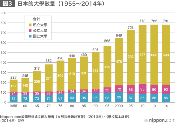 導致如此嚴峻形勢的背景,是20世紀90年代以來大學數量的激增。90年代日本大幅修訂了《大學設置基準法》,放寬了興辦大學的審批條件。因此,大學不斷增設新名稱和新教育課程的院系。國內大學的數量,當時包括國立、公立、私立在內一共大約是500所,而現在則增加到了780所。在大學數量增加的同時,18歲人口90年代後卻減少了40%,致使招生不足的大學陸續出現。
