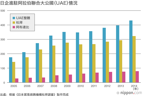 進駐UAE的日本企業也顯著增多,2014年已達431家(日本貿易振興機構的調查數據),僅在杜拜就有323家。助推日本企業進入UAE的是「經濟特區」的設立和房地產價格的大幅下跌。UAE的經濟特區實行一系列的優惠政策,諸如可以成立獨資法人、不徵收法人稅和關稅、沒有必須僱用UAE公民的義務、不限制向國外輸送資金等。另外,房地產價格也已跌至泡沫時期的3分之1,投資環境大為改善。
