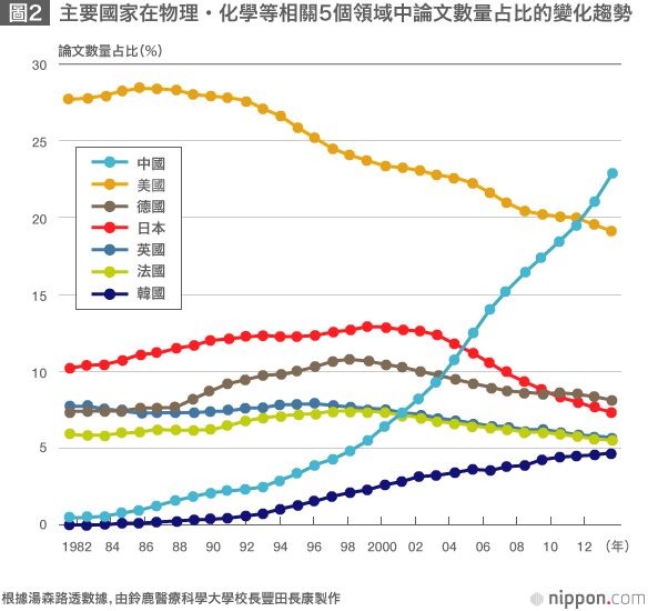 湯森路透以7個主要國家為對象,在物理學、化學、生物學、材料科學、宇宙科學5個領域所做的統計顯示,1982年該公司資料庫儲存的全世界科研論文共121,739篇,其中來自美國的最多,有33,744篇;其次是日本,為12,534篇。