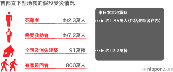預計最多會有800萬人(因交通網癱瘓)有家難回,光是東京一地最多約達490萬人的規模。據說屆時前往避難場所的避難人員最多將達720萬人,假如今後政府不積極採取措施以確保充足的臨時居住場所,恐怕會有大量人員無處安身。