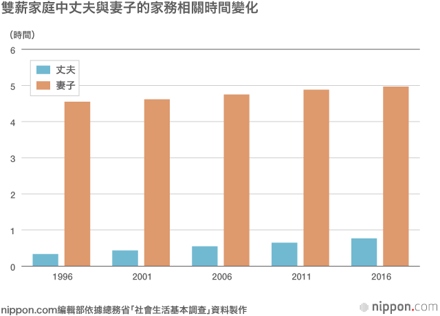 總務省2017年9月公佈的「社會生活基本調查」顯示,有小孩的雙薪家庭中,妻子從事家務的時間為日均4小時54分,而丈夫僅為46分,兩者之間的差距達6.5倍之多。該調查為每五年實施一次。相較於20年前,丈夫從事家務的時間已從20分增長到46分,翻了一倍多,但與妻子從事家務的時間相比仍有很大差距。雖然女性走向社會的情況有所改善,但夫妻的角色分工完全沒有改變,再次凸顯出家務負擔由女性一肩扛起的問題。