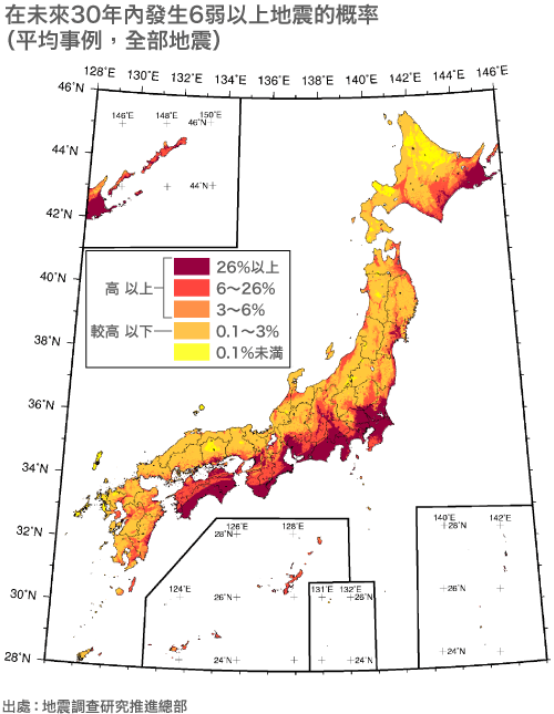 日本政府公佈的《全國地震動預測地圖》顯示,日本首都圈、東海圈和關西圈的太平洋沿岸等人口密集地帶,在未來30年內發生6弱以上地震的概率很高。