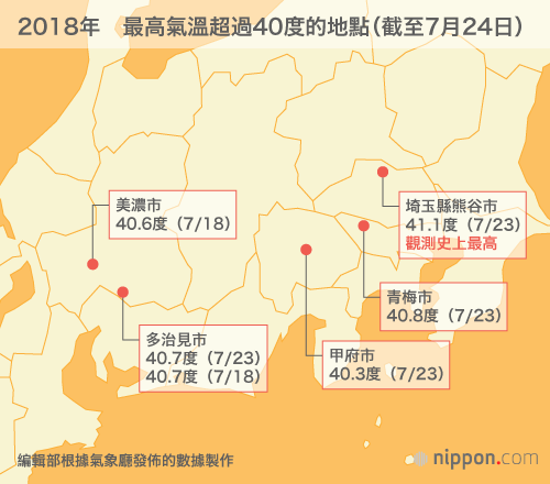 | 7 | 岐阜縣多治見市 | 40.7 | 2018年7月18日 |