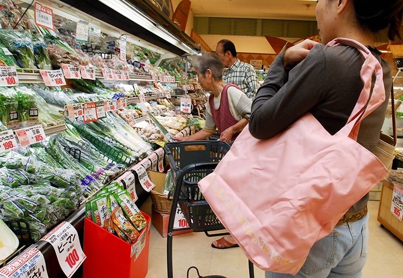 實施塑膠袋收費制度的超市裏,自備環保袋來購物的顧客(圖片:時事通信社)