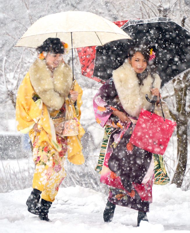不知何故,成年禮這一天經常會下雪,過去30年的數據顯示,東京近郊(關東地區)成年禮下雪的概率也有13%,而且10年裏至少會遇上一場大雪。準備和服的時候必做的一件事,就是要確認儀式當天的天氣預報。