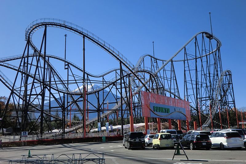 富士山的山腳下有個「富士急樂園」,裏面「恐怖飛車」應有盡有。最受歡迎的設施「Eejanaika」是金氏世界紀錄認定的4D雲霄飛車,上下翻飛的圈數(腳上頭下的顛倒次數達14次)為世界第1。乘坐飛車時兩腳保持搖搖晃晃的狀態,飛車運行中身體被機器向所有方向揮舞著甩來拋去,你可以一邊忍受著這種驚險刺激,一邊眺望遠方的富士山。