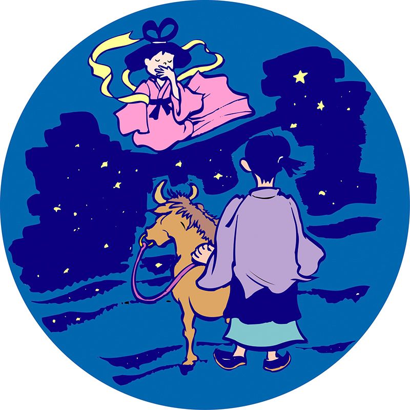 牛郎和織女,只有在7月7日才被允許相會。本來,織女是織布行家,牛郎是放牛能手,但兩人結婚後開始疏於勞作。織女的父親天帝(統治天的神)一怒之下,把他們隔離在銀河兩岸。天帝允許牛郎織女在「勤奮工作一如從前」的條件下,每年相會一次。因此,牛郎織女滿懷翹企七夕之情,拼命工作,直到今天。