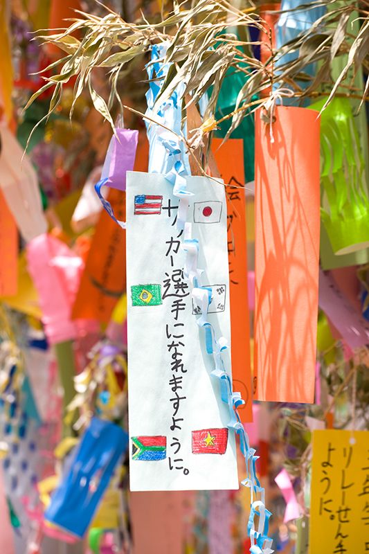 臨近7月7日七夕節,人們將寫有心願的彩條詩箋、色彩繽紛的竹枝裝飾在車站周圍和街道兩旁。「我想成為足球選手」、「希望我的繪畫越來越好」……眾人的心願隨風飄蕩空中,宛如一首夏日的風景詩。