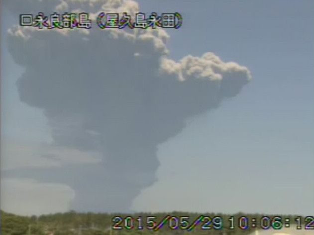 從口永良部島的新岳噴發出的火山煙雲,2015年5月29日上午,氣象廳網站(圖片提供:時事通信社)