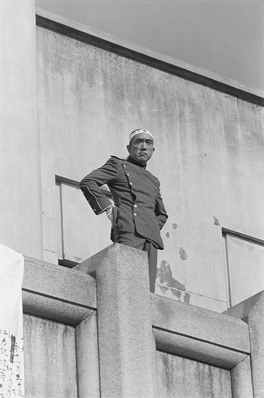 三島由紀夫與「楯會」4名成員闖入東京市谷的自衛隊駐地,並在東部方面總監部建築物的陽臺上演講(1970年11月25日,時事社)