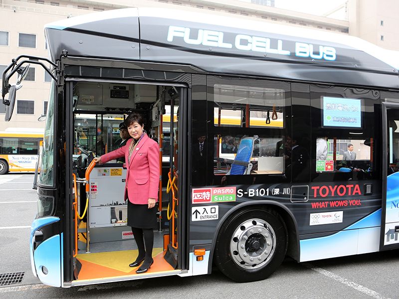 東京都交通局首批2輛燃料電池公交汽車投入運行。這種車利用氫與空氣中的氧發生化學反應而產生的電力行駛,不會排出二氧化碳。這2輛公車行駛於東京站和東京國際展覽中心(BIG SIGHT,位於江東區)之間。到東京奧運帕運召開的2020年,包括民營公交公司車輛在內,東京政府計畫將投入使用100輛以上燃料電池客車。