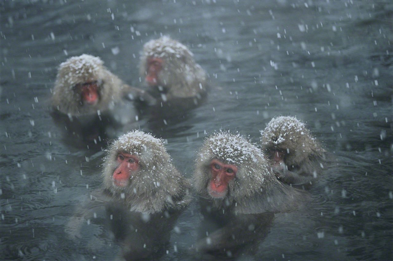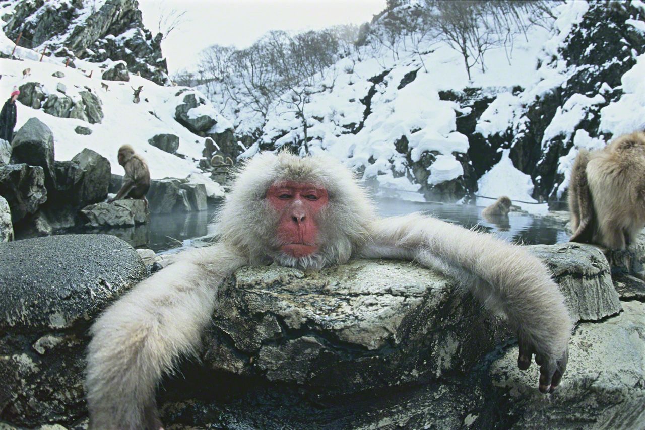 隆冬的地獄谷,覆蓋著深達2m以上的積雪,氣溫日復一日在冰點下徘徊。大量的雪猴聚集到公苑的露天浴池,讓溫暖的泉水為牠們暖身禦寒。頭頂白雪閉目養神的老猴、相依相偎的子母猴、溫暖中昏昏欲睡的母猴……。每一隻雪猴浸泡在溫泉中的表情,都是那麼愜意自得。不過在雪猴中間,也有一些雄猴,或許是因為討厭溫泉,牠們再冷也決不入溫泉。相反,你也可以看到一泡就是兩個多小時,以至於從溫泉出來後頭昏腦脹,東跌西撞的雪猴。