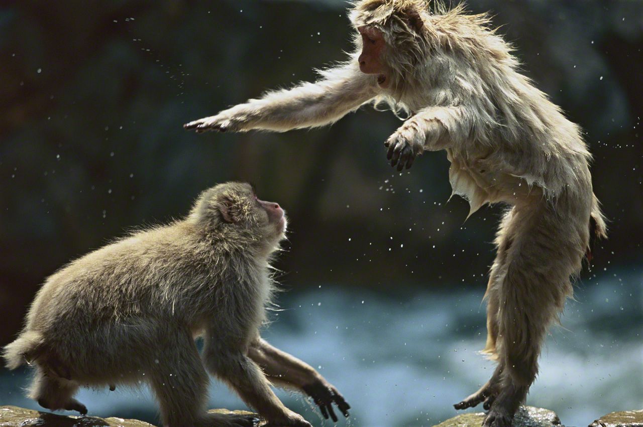為搶奪食物而爭吵的猴子。一隻猴子跳起來,居高臨下以示強大,威嚇對方 9月